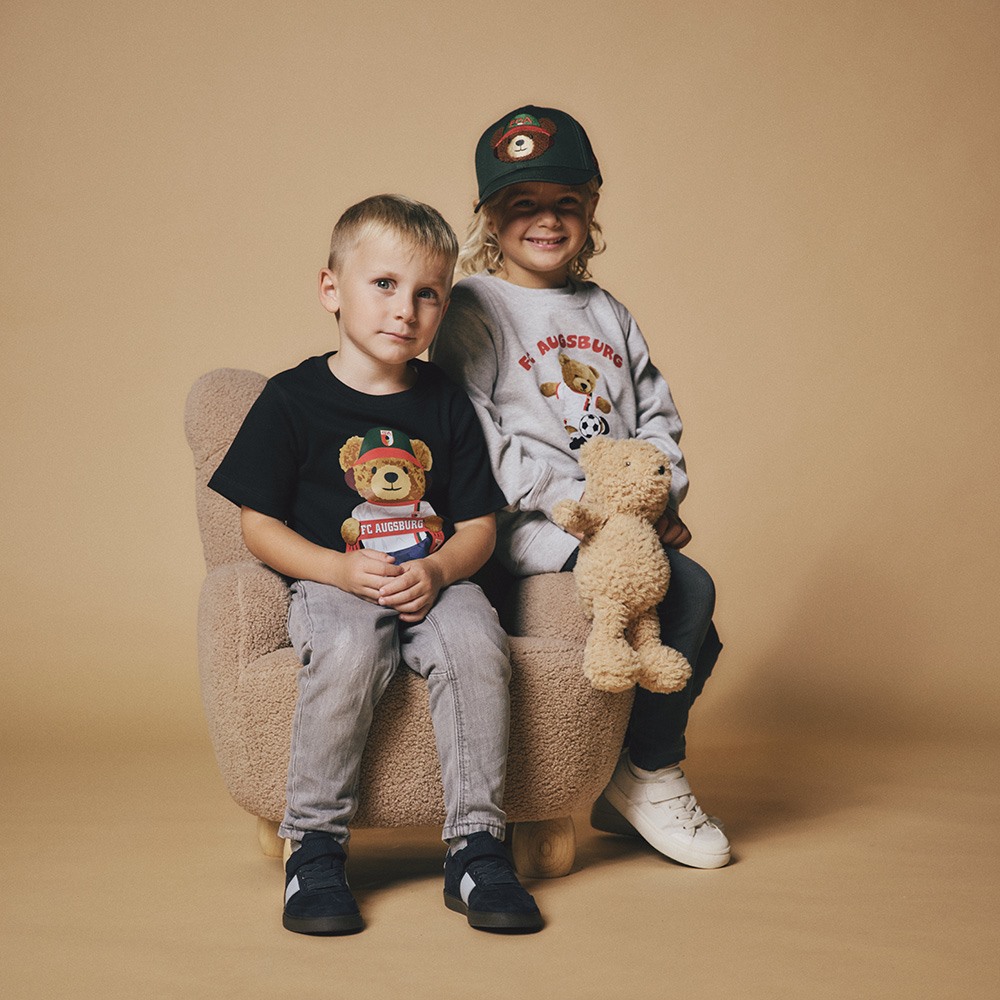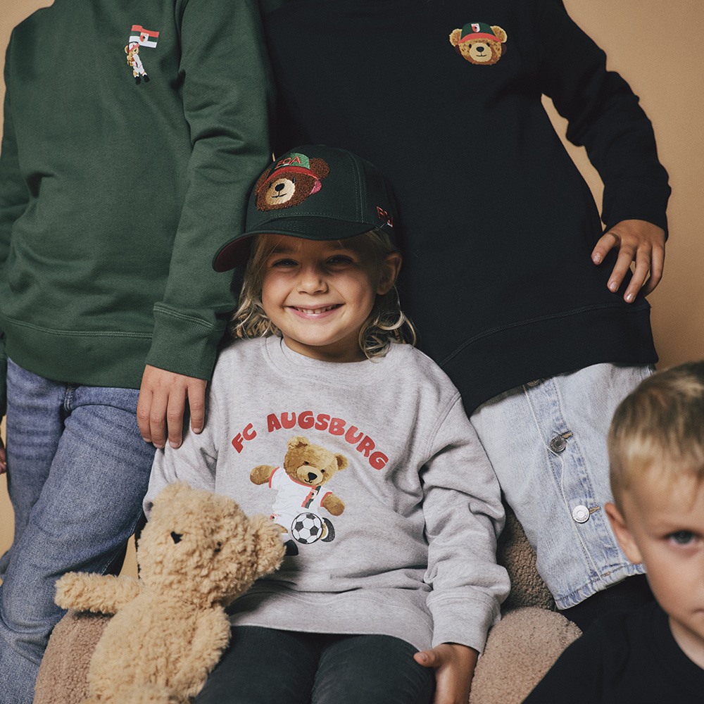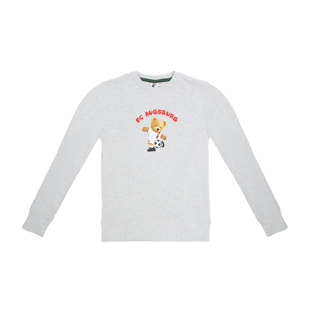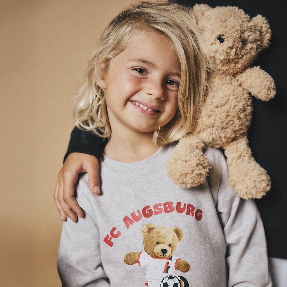 Der FCA-Kinder Sweater Teddy in Hellgrau ist ideal für kältere Tage und ziert einen sportlichen Teddybären der im FCA-Trikot einen Fußball jongliert. Über dem Motiv prangt ein roter Schriftzug "FC AUGSBURG", der die Vereinszugehörigkeit zu unserem FCA unterstreicht.